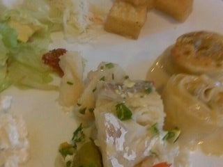 Risoto de palmito sem graça, guichê aguado, pastelzinho de queijo salgado, torta de frango com pedaço de cartilagem e osso de frango! Definitivamente o cozinheiro eh fraco!