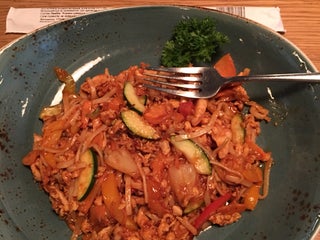 Обеденное меню в будни с 12'00 до 16'00: каждый день вариантно. Куриное филе в маринаде: кинза достаточно подчеркивает пряность и аромат блюда! Лапша удон с устричным соусом отлично подошла к мясу